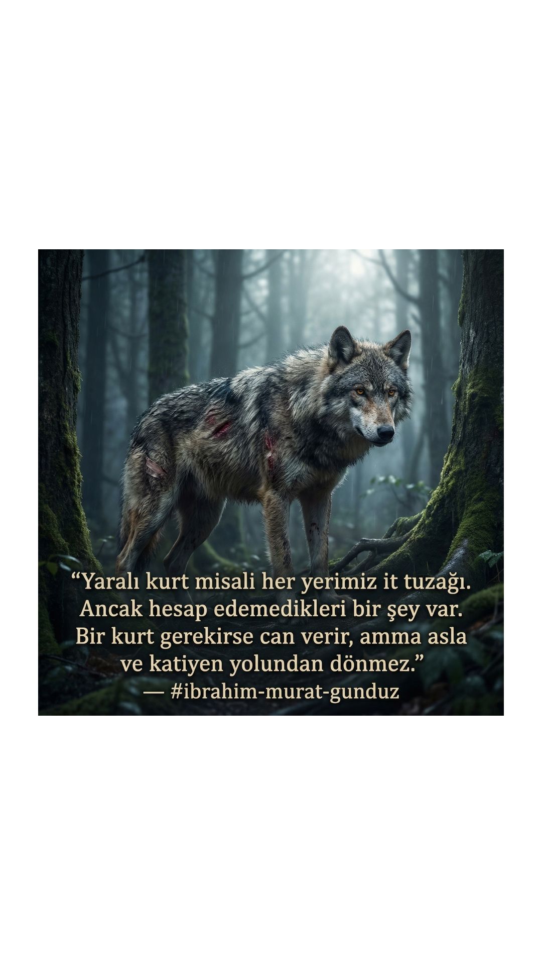 Türk milletinin sembolü boşuna bozkurt değildir. Şu sebeple bozkurt bağımsızlığın, onurun ve başkaldırının simgesidir. Eğer bizlerden kayıtsız şartsız itaat beklenmiş olsaydı, sembolümüz bozkurt değil koyun olurdu. Koyun, sürünün peşinden giden, boyun eğen, kendi yolunu çizemeyen bir varlıktır. Zaten Rabbim tarafından kurbanlık olarak yaratılmıştır. Biz kurban değiliz, asla olmayız; fıtratımız gereği bozkurtuz.